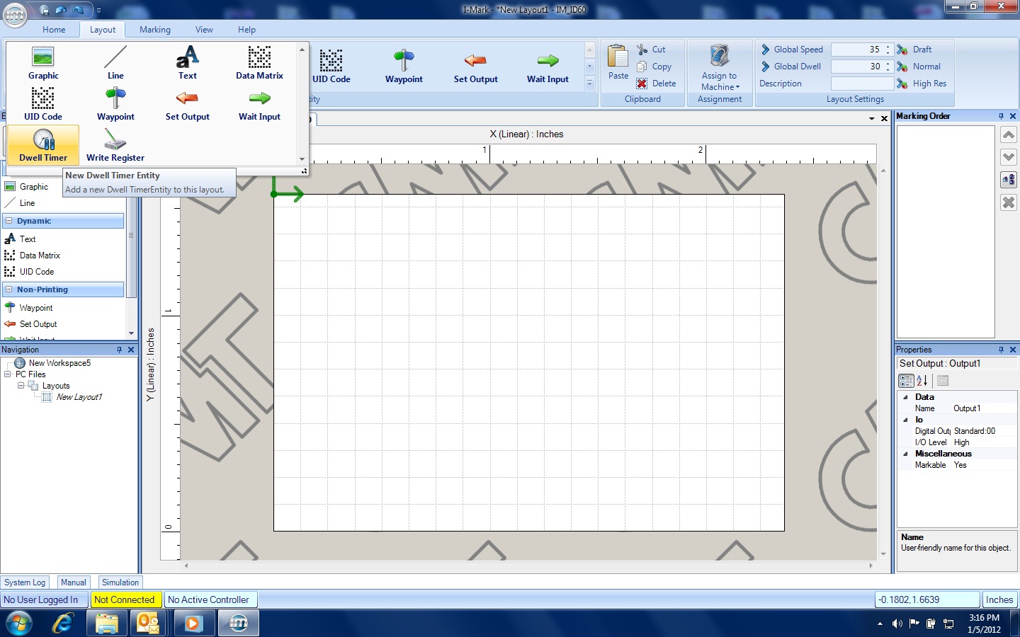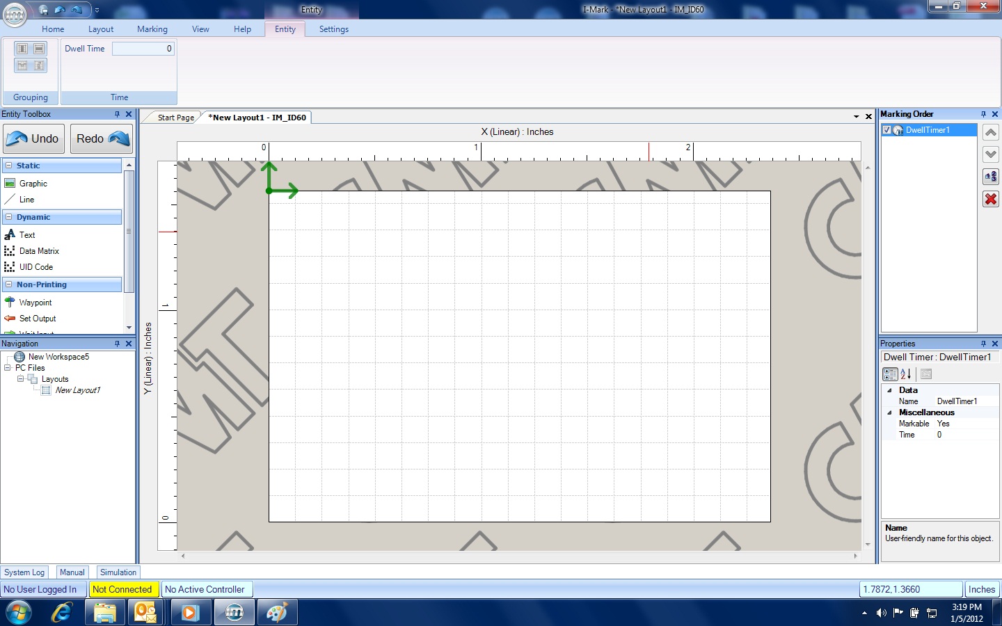 This entity is a non-printing object so it will be added to the Marking Order Menu but nothing will be added to the graphical portion of the layout. When added to the program this entity pause the program for the set amount of time and then proceed to the next entity in the program.