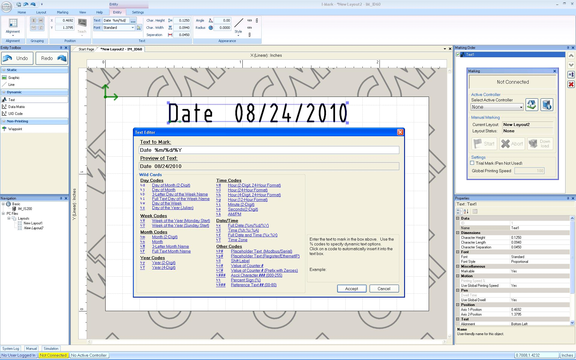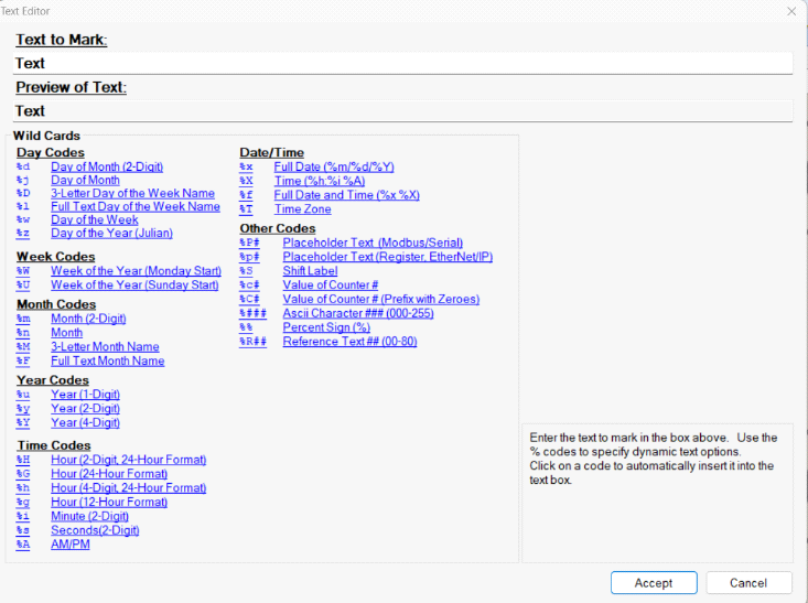 Example sequence: Date %m/%d/%Y - Click Accept to save the text string.