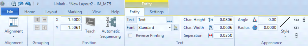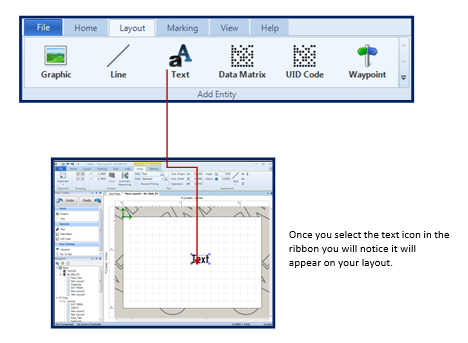 Text entities allow you to insert alphanumeric content into the marking layout.