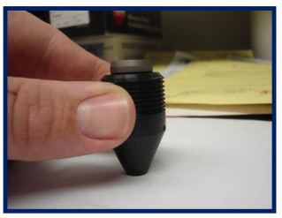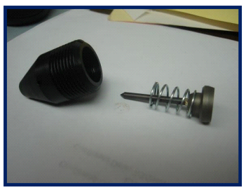 To replace the pin, assemble the spring and pin back together according to this picture above and hold the assembly in your hand again. Now with you thumb press the piston side of the pin firmly into the housing to seat the pin the assembly.