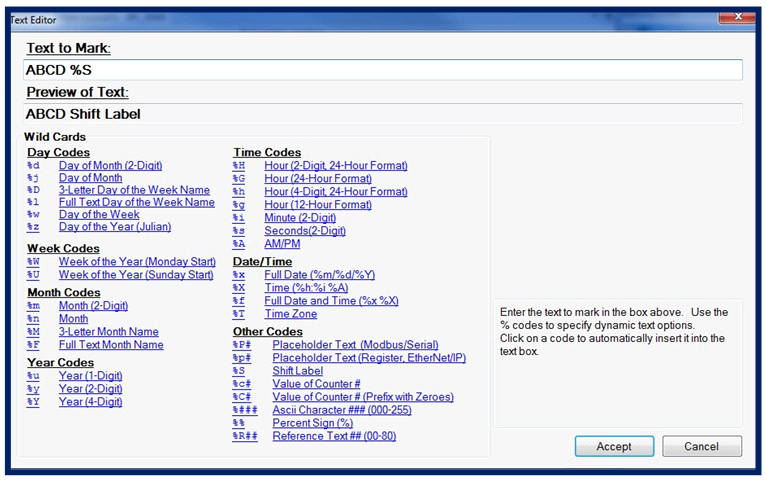 I-Mark software allows production shifts to be tracked and printed directly on parts. Shifts can be added, named, and linked to layouts using a dynamic code.